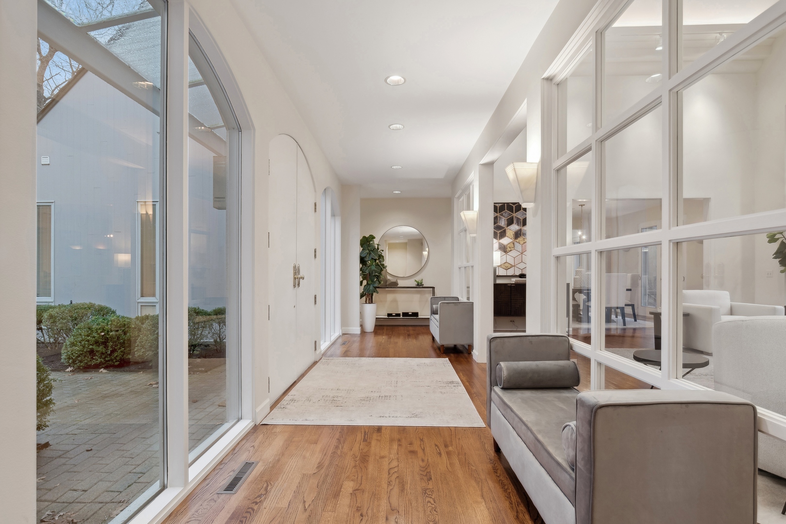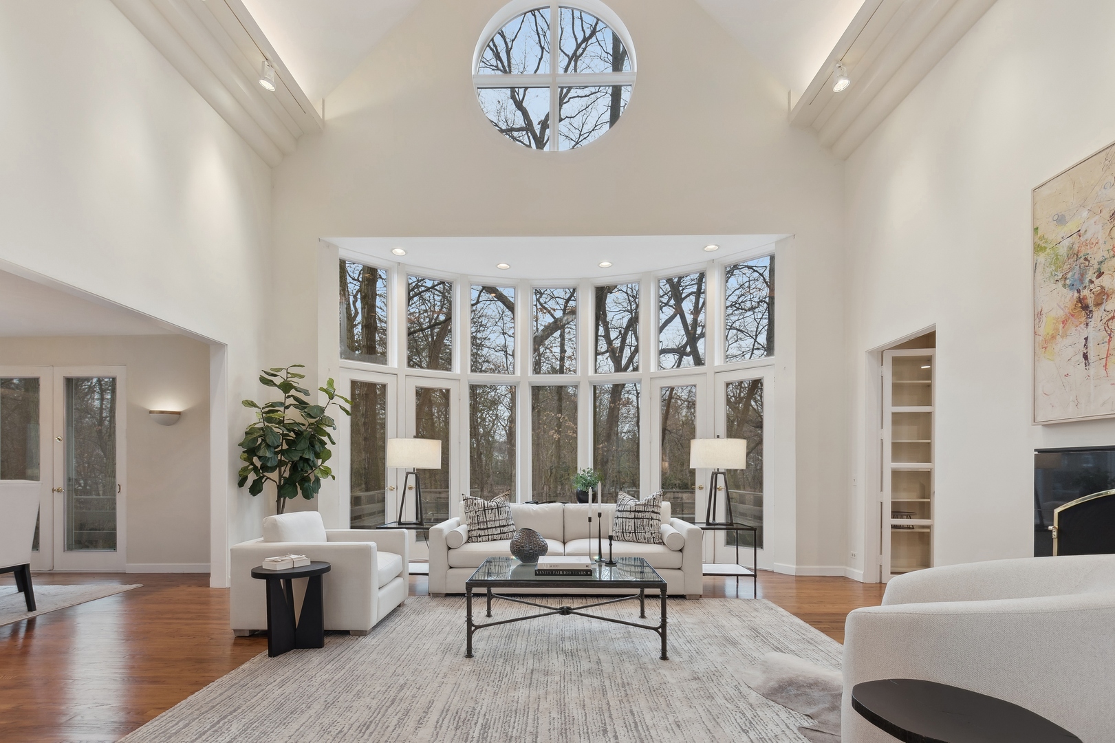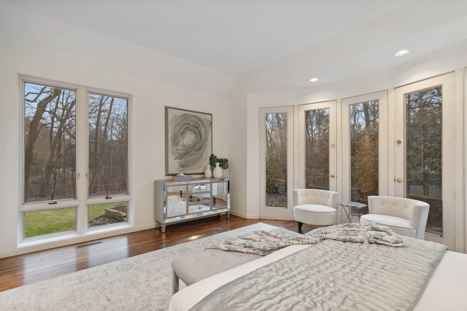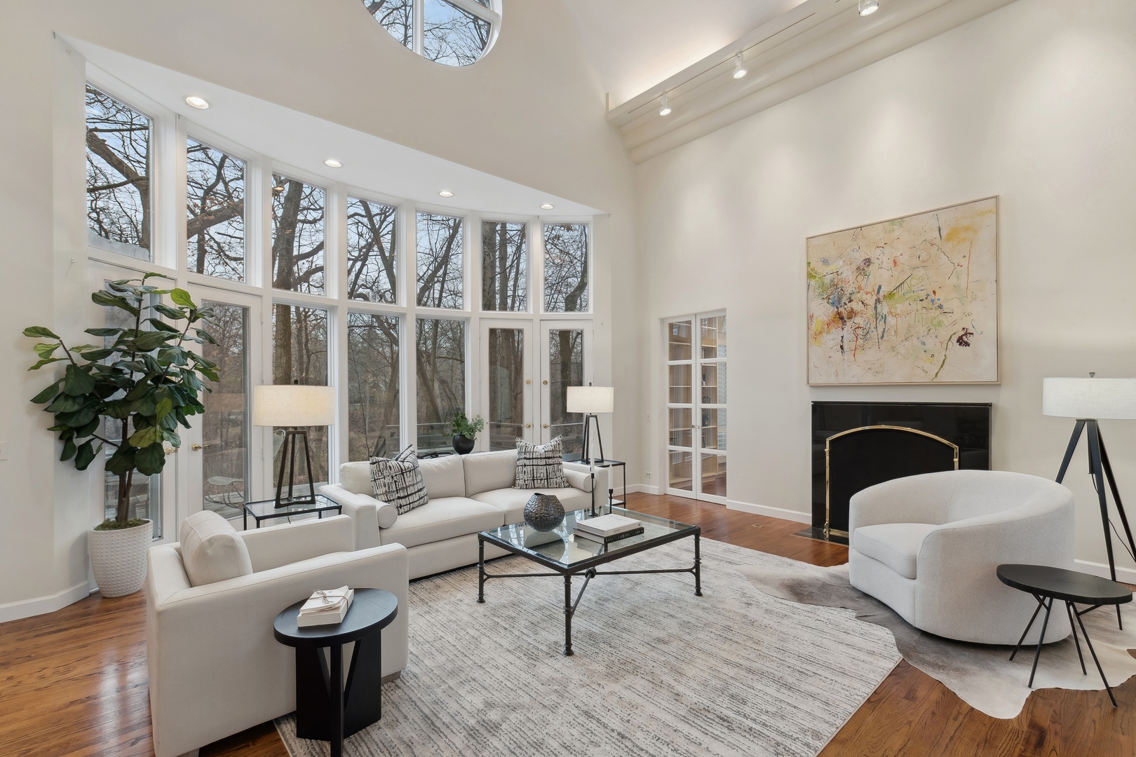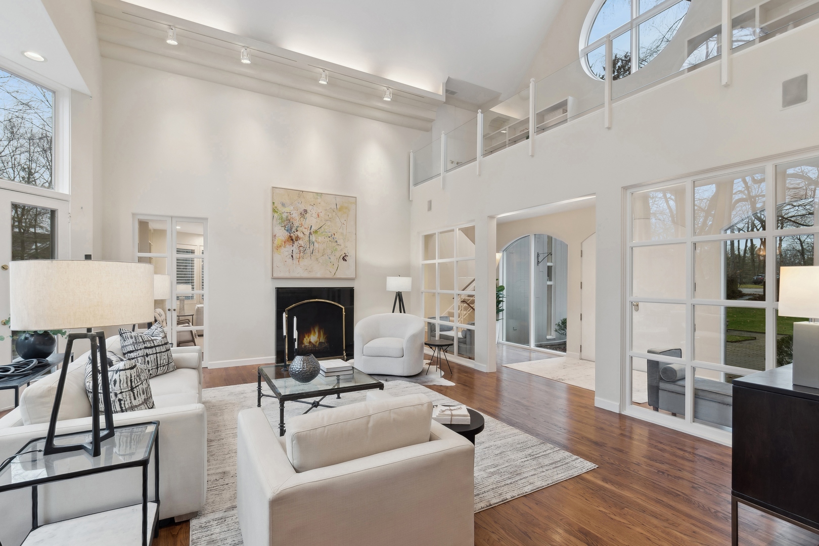 NEWLY REVITALIZED to echo the contemporary essence of this architecturally striking property, the home's interior design harmonizes its modern ambiance with a picturesque ravine setting. Nestled at the end of a quiet cul-de-sac within the sought-after Havenwood Subdivision, this Post-Modern home designed by architect Roy Binkley is a captivating blend of form, function, light, and views. The southeast-facing orientation of the house allows natural light to flood the interior throughout the day. The home spans approximately 4,789 square feet above grade including two walkout lower level rooms. The first floor boasts a dramatic Living Room with a fireplace, soaring ceilings, and a wall of windows overlooking the ravine, a large formal Dining Room, a Kitchen with an island, an eating area, and a sitting room. Other highlights include a Den with built-in custom cabinetry and a first-floor primary or private guest suite with a full bathroom and vaulted ceilings. The second floor features a second primary suite and two large family-sized bedrooms. The lower level is equally impressive, offering a large Family room and an office (or fifth bedroom) with a fireplace, both with exterior access, a full bathroom, an exercise room, and plenty of storage space. Additional features include a first-floor laundry room and a three-car heated garage. From most rooms will you enjoy stunning year-round views of the Ringwood Road ravine, recently restored and maintained by the City of Lake Forest, and boasting beautiful native trees and flowers. Whether you are drawn to the architecturally unique design, the tranquil ravine setting, or this wonderful east Lake Forest neighborhood close to South Park and a short distance to the beach, this property has it all.